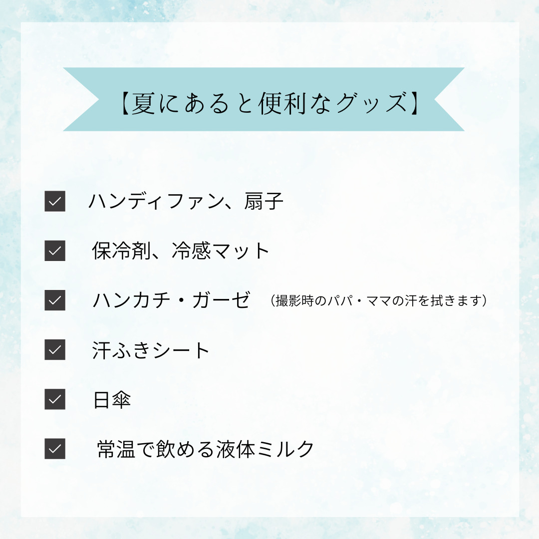撮影中に水分補給・ご休憩・ミルクなどが必要な場合は、どうぞ遠慮なくお声がけください。
