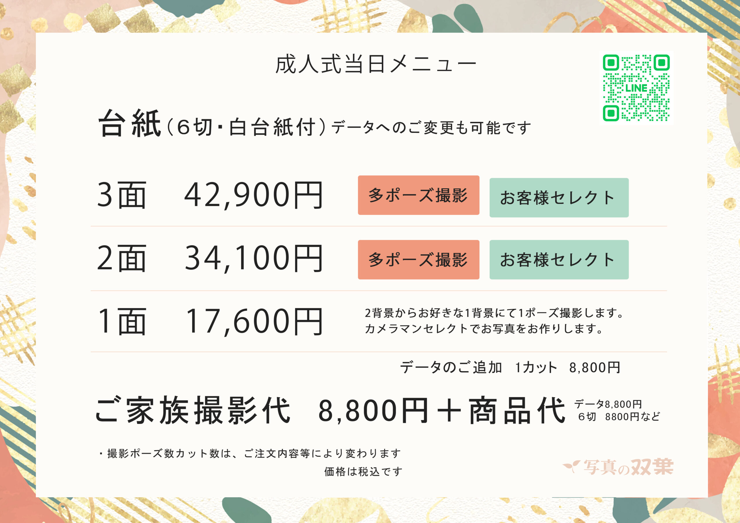 成人式当日(1/11・12)は、 ご予約なしでの「成人式の撮影」の受付しております。 女性・男性・ご家族・グループ撮影もOK お電話がつながらない場合は、直接お越しくださいませ。 ※ご予約の方が優先となります ご予約は0120-558-753
